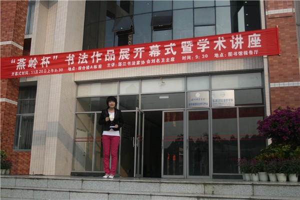 湛师新闻网11月21日讯 11月20日上午,我校书法协会在综合楼A栋门前举行“燕岭杯”第四届大学生书法作品展开幕式,并在我校图书馆四楼视听室举行学术讲座。中国书法家协会会员、湛江市书法家协会主席刘名卫先生,中国书法家协会会员、湛江市书法家协会常务副主席崔耀天先生,校党委宣传部理论科科长关天冲先生,校书协指导老师卓大、黄建文先生,海大生物公司董事长郑吟先生以及各兄弟院校的书法爱好者出席现场。