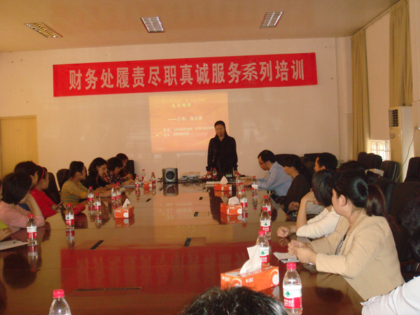 湛师新闻网11月19日讯 为响应学校机关党委的号召,贯彻落实机关单位创建学习型、创新型、服务型、效益型、廉洁型、诚心型“六型”机关的工作目标,进一步改善机关作风,提高工作效率与服务质量,近日,我校财务处开始启动“履职尽责真诚服务”系列培训,邀请全国通用管理培训师张文春老师在行政楼三号会议室举办服务礼仪培训讲座。