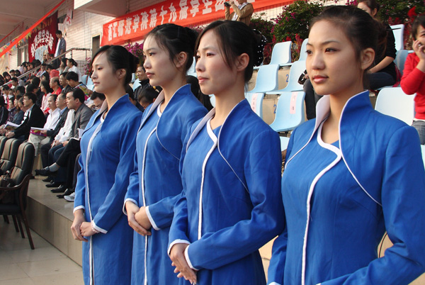 在这蔚蓝的天空下,除了炫彩夺目的运动健儿们,呐喊活跃的拉拉队们,积极救援的白衣天使们,别忘了,还有一缕默默的淡淡的蓝——礼仪小姐,在微笑着、守候着!