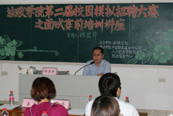 湛师新闻网11月16日讯 为了给大学生与企业的零距离接触提供机会,增强大学生对企业的了解程度,提高在校大学生的应聘、求职技巧和社会竞争力,帮助大学生奠定就业的经验基础,近日,法政学院在弘雷楼305室举行第二届校园模拟招聘大赛之招聘面试技巧培训讲座,中国联通湛江市分公司人力资源部经理林宏开先生担任主讲人。