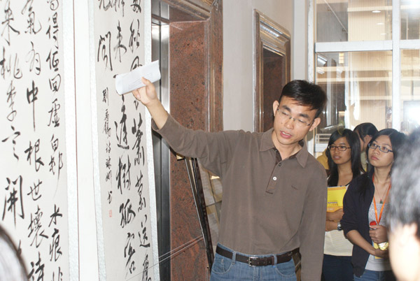 启动仪式结束后,在场的领导和老师现场观看了学生们的作品。黄达海部长、卓大老师和参展学生就书法作品进行了交流,指出其存在的问题和今后需要努力的方向。