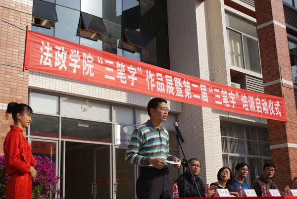 法政学院全柱副书记为启动仪式致辞。他指出,法政学院坚持一体化全员育人,按照分年级、分层次培养人才的工作思路,举行“三笔字”专项培训课程和各种比赛,力求每位师范生都能正确运用毛笔、粉笔、钢笔,并为广大书法爱好者搭建更好的学习交流平台。他要求同学们要继续秉承“传承国粹,自我陶养”的精神,在书法练习中坚持不懈,争取更大的进步。