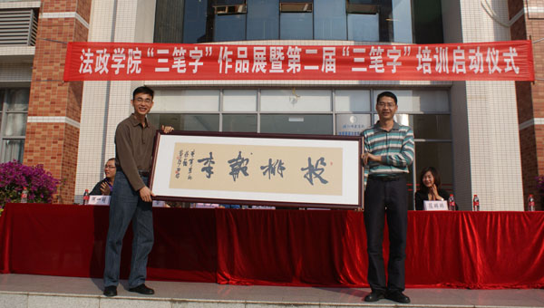 启动仪式上,黄达海部长向法政学院赠送了他亲笔题写的书法作品,并为比赛获奖选手颁奖以及为“三笔字”教员颁发聘书。