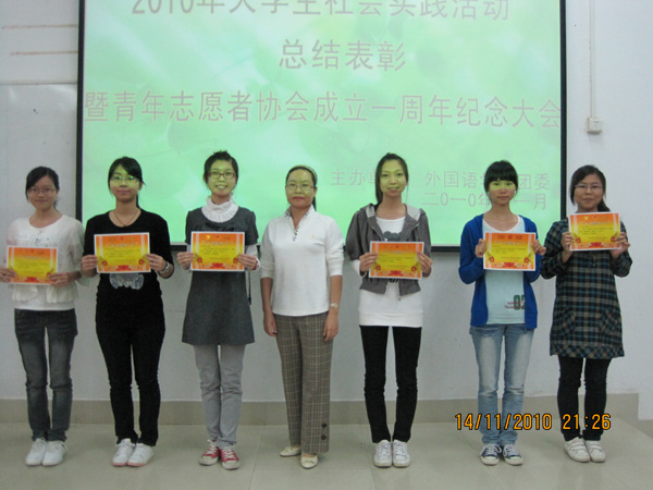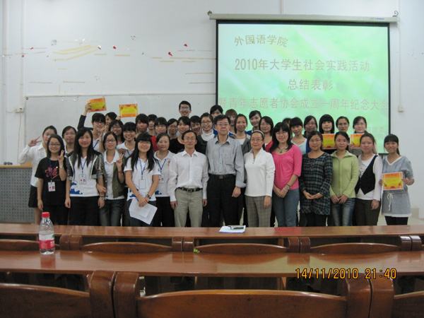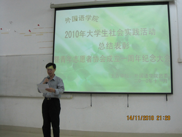 湛师新闻网11月15日讯 昨晚,外语院在弘雷楼—611教室举行2010年大学生社会实践活动总结表彰暨青年志愿者协会成立一周年纪念大会,对在社会实践与志愿服务活动中的先进集体及个人进行表彰。外语院党委孙卫东书记、冯彩莲副书记及辅导员老师出席了大会。