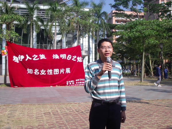 湛师新闻网11月13日讯 今天,由法政学院学生会主办、学生会权益部和女生部协办的以“观伊人之美,焕明日之魅”为主题的知名女性图片展于体育馆前举行。该院党委副书记全柱、辅导员彭展、莫智明、赖彩虹、陈琳琳老师参加了活动。
