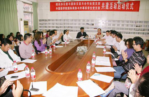 会上,支部书记、院办邓逢光主任就开展支部共建的目的、选择及设想作了阐述。他指出,开展新一轮支部共建活动是为了贯彻落实学校创新人才培养模式的意见精神,发挥大学合力育人的职能及机关教学单位资源共享的优势,推进支部“创先争优”工作,创建优质党建示范点,培养高素质应用型人才。与外语学院学生党支部开展共建活动,主要是考虑到支部人员的专业背景、工作性质和职业发展的互补性等因素,有助于保证共建活动的针对性和成效性。在双方的共同努力下,建设学习及实践共同体,创建“学习、和谐、共生型”党支部。