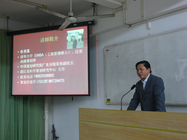 湛师新闻网11月9日讯 11月6日,我校招生与就业处主办的“2010年大学生就业实训月系列活动”讲座之——“策划你的人生”在弘雷楼502教室举行。清华大学EMBA(工商管理硕士)、注册高级策划师、中国策划研究院广东分院常务副院长、湛江市科学策划研究中心主任杜青霖先生主讲了本次讲座。