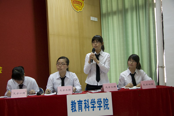 第二场亮相的是体科院和教科院,正反双方就“中学生是否应该尽早接触社会”展开激烈的半决赛入场券争夺。教科院紧紧扣住题目中的“中学生”的词典定义阐明观点,认为中学生的心智尚未成熟,容易受社会不良因素的蛊惑,犯罪率高,中学生不应该过早接触社会。体科院的辩手则认为,社会是一本厚重的书,中学生不应死守学校和家庭的教育环境,还应该尽早接触社会,体验社会,健全成长。辩驳中,双方多面引用论据,在“自古少年出英雄”“读十年书行万里路”等古语上也展开了较为充分的较量。在雄辩的过程中,两个学院都体现了自身的专业特点,教科院充分展示了强烈的思辨性思维;体科院则采用灵活的战略战术,避其锋芒,猛烈出招,令对手措手不及,体科院也成功晋级半决赛。