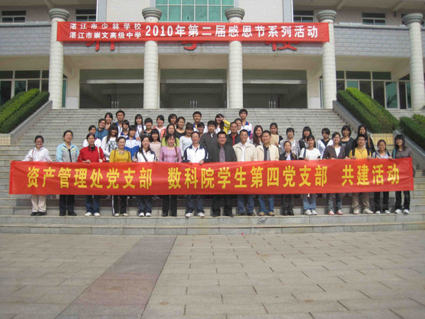 迎着和暖的秋日阳光,两支部的党员兴致勃勃地在湛江市少林学校的领导带领下参观了环山伴水、环境优美的校园,并召开了交流会。会上,该校张军副校长介绍了该校“以文化教育为主,以武术教育为特色”的办学理念和发展状况。两支部的师生与少林学校的师生进行了热烈的交流,并提出了进行数学教育教学实践合作的意向。资产处李小戈处长对少林学校的办学给予了高度的肯定,并对他们的热情接待表示了衷心的感谢。