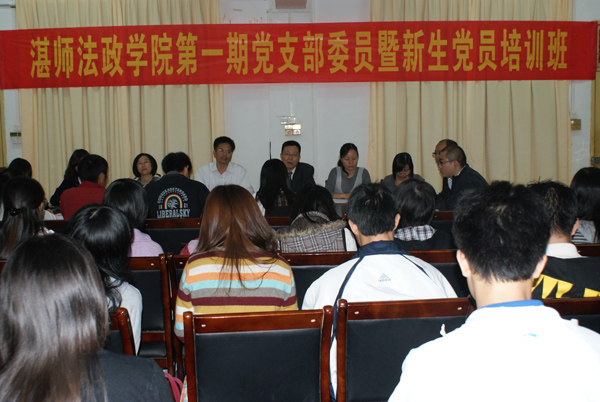 湛师新闻网11月4日讯 昨晚,法政学院在弘雷楼三楼会议室举行第一期党支部委员暨新生党员培训。该院党委冯亮如书记,历史系景东升博士,六名辅导员老师,以及该院党支部委员和10级新生党员出席了本次培训班。