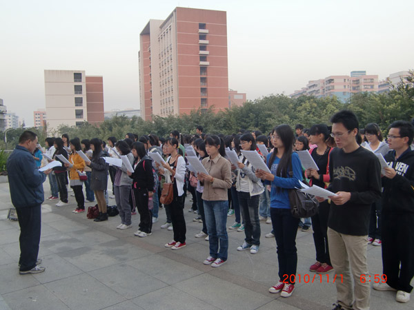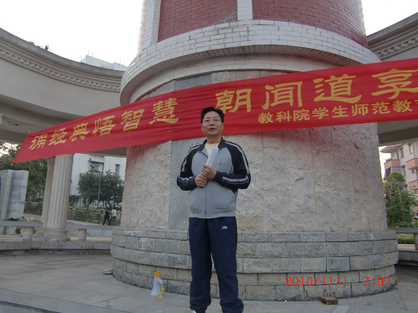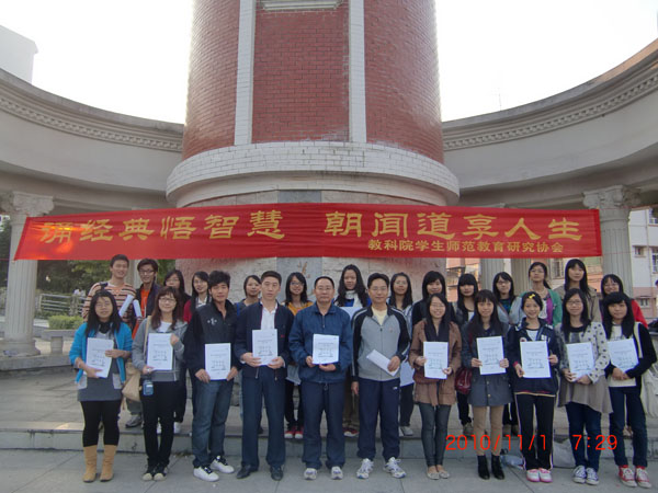 湛师新闻网11月2日讯 昨天,教科院学生师范教育研究协会在百年师范塔前,举行主题为“诵经典悟智慧,朝闻道享人生”的教育经典晨读活动启动仪式。教科院党委书记王列盈书记,指导老师卢建筠博士,辅导员魏珂老师以及该院的学生干部和110多名晨读活动成员参加了启动仪式。