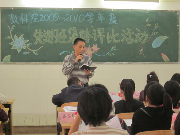湛师新闻网11月1日讯 昨天下午,教科院在燕雷楼402室举行了2009—2010学年度“先进班集体”评比活动。教科院党委郭和才副书记,辅导员魏珂、卢祖琴老师以及该院学生会主要干部和各二级学院学生会办公室干部等参加本次活动。