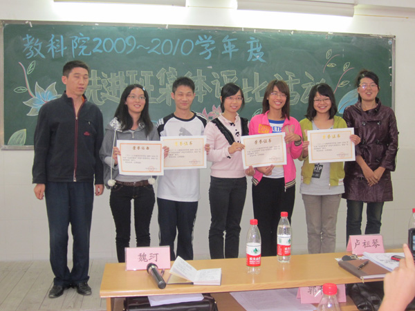 本次活动以班子建设、班风建设和学风建设三个方面作为评优标准,共有14个班参与了此次评优。参赛各班代表结合他们精心制作的PPT做了精彩的解说,认真地汇报并总结了本班在过去一学年所取得的工作成果。每个班都彰显出了各自不同的特色和优势。最终,08教本2班以其显著的优势获得了此次评比活动的第一名,这是继他们上一学年获得“先进班评比”的第一名后再次摘得桂冠。在过去的一学年里,08教本2班不仅在班级各项日常工作中取得显著的成效,也在各种大型的比赛中屡获佳绩,班风学风卓越,是名符其实的榜样班级。而07教本1