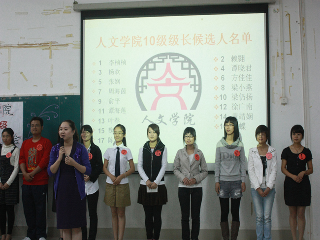 湛师新闻网10月31日讯 昨晚,人文学院在弘雷楼211教室举行了10级级长竞选大会。人文学院党委谢应明书记、冯基聪副书记、辅导员詹绍姬老师参加本次大会。