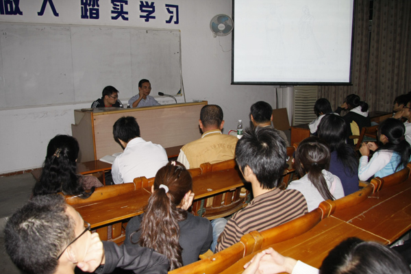 接着,冯先生开始他精彩的讲座。他的讲座主要分为三个部分:第一部分介绍雷州半岛的历史名人和人情风俗。冯先生提到,雷州半岛文化悠久,曾是汉代海上“丝绸之路”的始发港,对雷州半岛经济、文化发展起到重要作用,也是湛江人民反抗法帝国主义侵略的阵地。第二部分重点讲解粤西历史文化名人,如中国第一位外交官陈兰彬、为开发台湾起到重要作用的康熙年间进士陈宾、粤西唯一状元林召棠等,使同学们进一步了解粤西这一块文化圣地及古人的突出贡献;第三部分向同学们展示具有粤西特色非物质文化遗产,如醒狮、傩舞、雷州石狗、木偶、吴川飘色等,让同学们大开眼界,加深对粤西地区的古老民俗文化的认识。