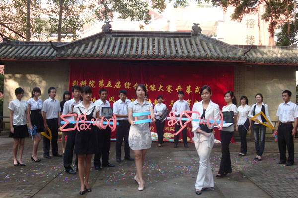 礼炮声中,数科院学生代表奉上的精彩节目——教师风采展示和琴棋书画表演。学生代表们穿着正式的职业套装,手持三角板、算盘、公事包、笔记本电脑等,他们脸带微笑,表情自信从容,成熟稳重的教师形象活跃于观众眼前。在这美妙的东方民族的声乐中,来自08数本(6)班的黄安桂同学即席挥毫,他笔翰如流,在曲终,也恰好把“天道酬勤”四个飘逸有致的大字展现在观众眼前,现场顿时掌声如雷,气氛被推向高潮。