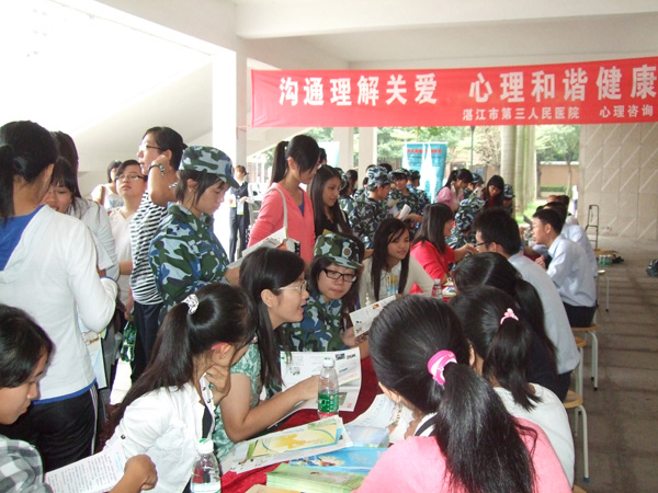 湛师新闻网10月13日讯 今年10月10日是世界第十九个精神卫生日,主题是“沟通理解关爱、心理和谐健康”。10日上午,湛江市卫生局、湛江市第三人民医院、我校教科院和心理协会在我校体育馆前举行宣传活动,为学生免费进行心理咨询、心理测量和发放心理健康及精神卫生知识宣传资料。湛江市卫生局监控科科长沈启刚、湛江市第三人民医院院长陈耀伟、党总支书记兼业务副院长陈志雄、医务科科长李田妹、我校教科院副院长郑剑虹、党委副书记郭和才、心理学庞海波副教授、辅导员魏珂老师以及心理协会所有理事都亲临活动现场。活动还吸引了湛江电视台和碧海银沙记者前来采访报道。