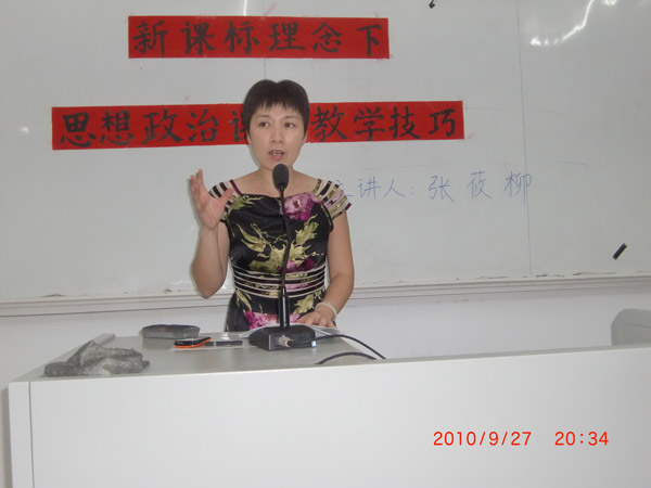 在讲座中,张老师主要围绕 “当今教育新的课程标准和要求”及“思想政治课的教学技巧” 讲解了四方面的内容:第一,同学们要以正确的心态对待新的课程标准和要求,打破传统思维,实现教与学的互动,努力增强思想政治教育的时代感、针对性、时效性和主动性;第二,她给同学分析了高中课程改革的历史背景和具体时间,并详细讲解了新课程改革中包括课程性质、课程设计思路、等方面的内容;第三,她结合自己的教学经验表示,备好课是上好每一堂课的必要前提。而要做好备课,就是要做到“五备”:备新课标、备教材、备资源、备学生和备教师;第四,高中政治教学过程是读、讲、议、练的过程,在讲课过程中注重因势利导,给学生充分的议和练的时间,在生活中注重素材积累。