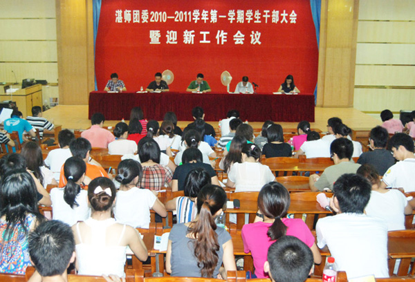 湛师新闻网9月9日讯 新学期,新起点,新思路,新突破。为科学规划新学期学校共青团工作,以良好的风貌迎接新同学的到来,校共青团昨晚在弘雷楼311室召开了2010-2011学年第一学期学生干部大会暨迎新工作会议。校团委李粤书记、李发武副书记等全体校团委老师在主席台就坐;校团委、学生会、社团联合会、青年志愿者联合会的全体校级学生干部及二级学院学生会主席、团委秘书长出席了会议。会议由校团委李发武副书记主持。