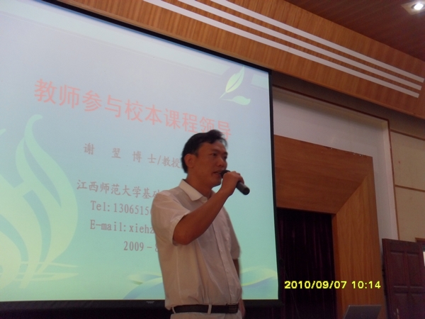 湛师新闻网9月8日讯 昨日上午,江西师范大学谢翌教授作客教科院,在图书馆学术报告厅做了主题为“教师参与校本课程领导”的精彩讲座。教育科学研究中心主任李方教授、教科院党委王列盈书记、张旭东院长等教科院领导班子和教育学部分师生聆听了讲学,宣传部陈恕平部长、科技处谭荣波副处长等职能部门领导也也参加了讲座。讲座由教科院院长张旭东教授主持。