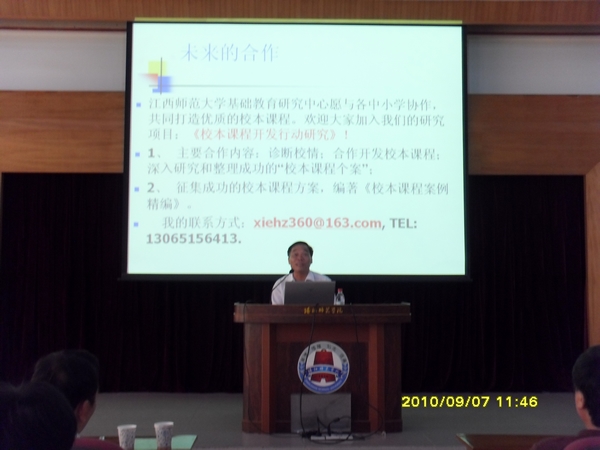首先张旭东教授简单介绍谢翌教授的学术科研等情况,接着谢翌教授引用鲜活的例子,提出教师是否有权调整课程、教师与课程之间应存在什么联系、怎样构建与校本课程配套的学校文化等问题,让听者也陷入沉思。