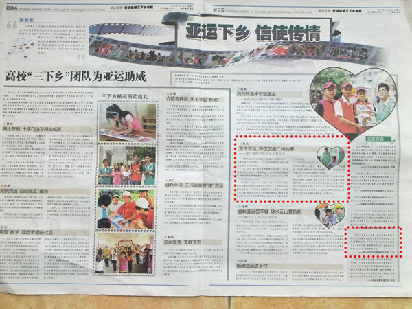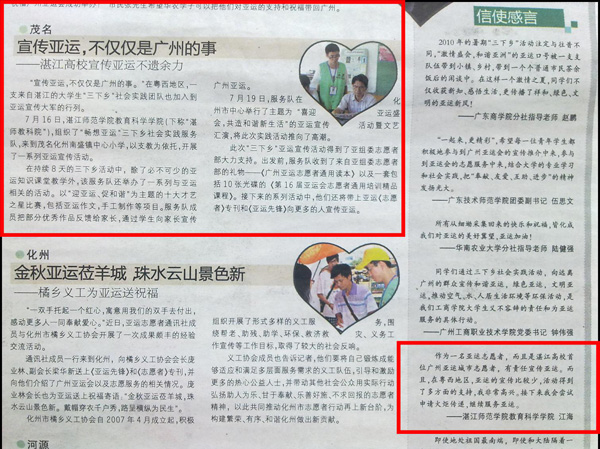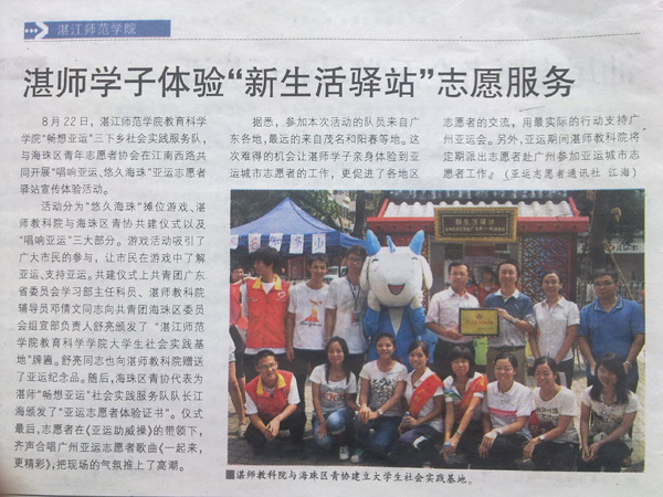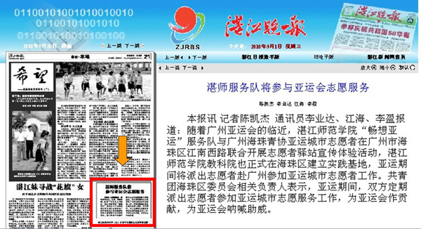 至今为止,“畅想亚运”服务队在电视台、报纸两大传统媒体的报道次数共计6次,其中化州电视台新闻1次;《广州青年报》活动报道2次;《亚运先锋报》专题报道1次;《湛江晚报》报道2次。成绩骄人。
