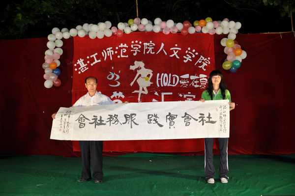 湛师新闻网7月24日讯 7月21日晚,在湛江师范学院人文学院“HOLD,爱在夏天”社会实践服务队的文艺晚会现场,吴川市文化广电新闻出版局副局长代表该局与吴川市非物质文化遗产保护中心向服务队赠送了题辞:“社会实践,服务社会”。