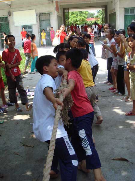 上午第三节课课后,由小老师们组织的拔河比赛开始了。拔河比赛要求各班派出十五名参赛队员,同年级的班进行比赛,然后决出年级冠军。只听得裁判一声哨响,操场上立刻响起一片加油之声;只见双方队员各个满面通红,紧咬牙关,弓着身子,拼了命似的把绳子往自己班这边拉。经过激烈的比拼,三个年级的冠军全部诞生。