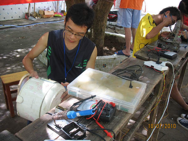 今天早上,服务队中来自电子协会的“师傅”神采奕奕地来到活动现场,展开为期一天的家电义务维修活动。虽然“康森”过后带来的降雨使维修活动一度中断,但队员们把维修现场移至遮雨处,继续维修活动。