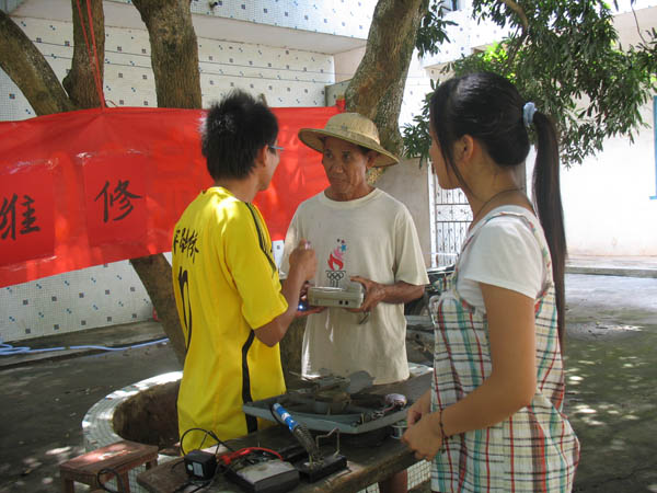 服务队本着信息学院电子专业知识和捧着为人民服务的竭诚热情,为当地居民维修家里的电话机、电磁炉、DVD机、录音机、电饭锅和饮水机等损坏的家用电器。队员们忙得不亦乐乎、大汗淋漓。