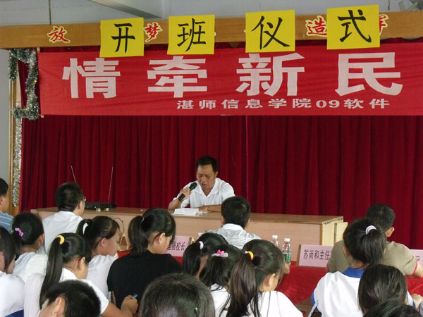 湛师新闻网7月18日讯 昨天下午, “花开东海”三下乡服务队开班仪式在湛江市东海区民安镇新民中学隆重举行。信息学院金义富院长、辅导员谢统年老师、民安镇镇委委员陈存桥同志和新民中学陈建强校长等出席了开班仪式。