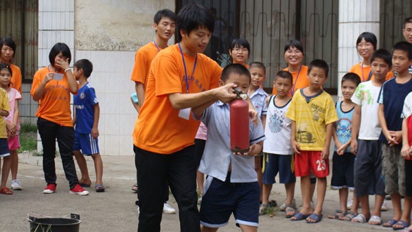 队员手把手教学生灭火