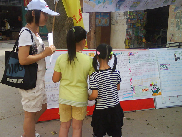 宣传组的成员一早就准备好材料去樟铺市场门口,摆放好宣传板和海报,以便让村民观看。随后就派发安全知识传单,各个组员深入到市场里面、外面的街道、附近的小商店等人流多的地方去,在派发传单的同时给他们讲解一下安全知识。最后是让村民们写些安全给语,把有关安全方面的话贴上栏板上。