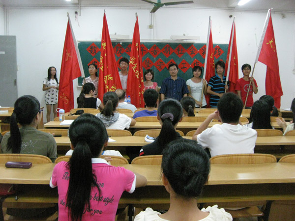 紧接着,陈玲普同学对今年三下乡情况作简要介绍。李院长宣布2010年大学暑假“三下乡”社会实践活动正式出征,并为各支队代表人授旗。