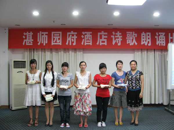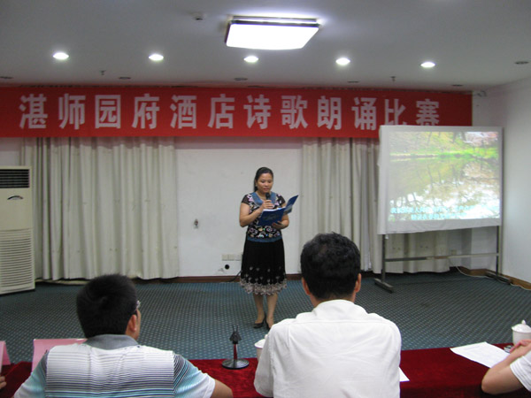 湛师新闻网7月11日讯 昨晚,湛师园府酒店诗歌朗诵比赛在园府三楼会议室举行,园府客房部、快餐部、楼面部、餐饮部及住宿部各部门员工代表参加了此场比赛。