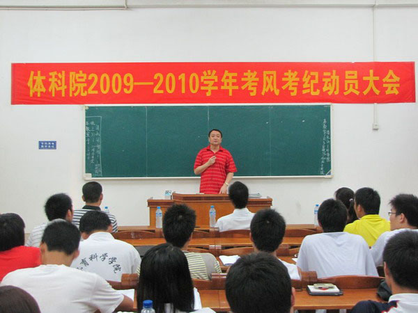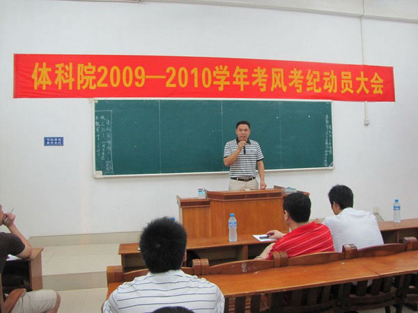 湛师新闻网6月29日讯 昨天,体科院于弘雷楼108教室召开了以“诚实守信,拒绝作弊,做一名有尊严的体育人” 为主题的考风考纪动员大会。该院副院长姚卫宇、副处级辅导员杨子江老师、和辅导员刘天明、莫毅、宋鹏老师出席了会议。会议由钟召春老师主持。
