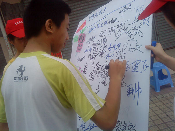 湛师新闻网6月21日讯 昨天,为迎接第十六届广州亚运会,向广大市民宣传亚运会知识,展示广州亚运的独特魅力以及时尚动感的现代体育精神,湛江师范学院教育科学学院学生会“畅想亚运”社会实践服务队于光辉市场举行了主题为“喜迎亚运盛会,共造和谐新生活”亚运宣传活动暨教科院学生会“畅想亚运”三下乡社会实践服务队成立仪式。