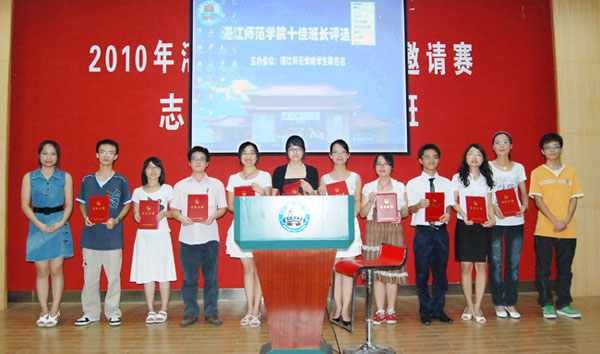 十佳班长名单:法政学院的谢宏森、谭凯瑶,外语学院的马晓霞,商学院的陈永敏,物理学院的袁嘉琪,数科院的罗成锦,人文院的李红艳,信息院的黄旭,教科院的黄婷以及体科院的刘会敏。