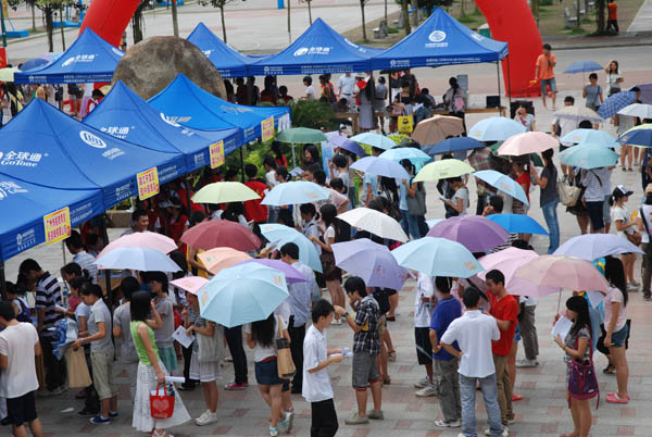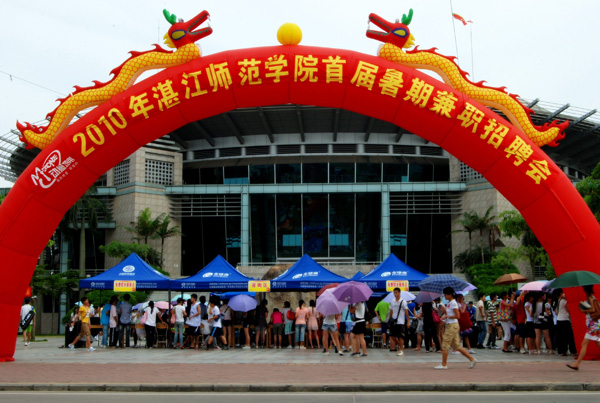湛师新闻网6月20日讯 畅通助学渠道,搭建实践平台;传播助学文化,弘扬自强精神。为了给我校家庭经济困难的在校大学生提供更多的勤工俭学机会,在学校各级领导的大力支持下,由我校学生工作部主办、校勤工中心承办,以“展现自我才能,绽放精彩人生”为主题的“2010年湛江师范学院首届兼职招聘会”于今天上午在体育馆门前隆重举行。近十家用人单位参与招聘,提供了300多个兼职岗位,截止活动现场应聘人数超3000人次,活动规模空前盛大。