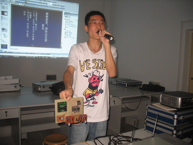 比赛先进行了作品演示。来自该院各个专业的12支团队通过PPT的形式,依次向评委讲解了作品制作的基本原理、主要功能、设计思路等内容,并详细地回答了评委老师的提问。“LCD多功能万年历”、“计程车计价器”、“USB数据采集器”、“鉴酒启瓶器”等精美的电子作品,赢得了在场观众的阵阵掌声。