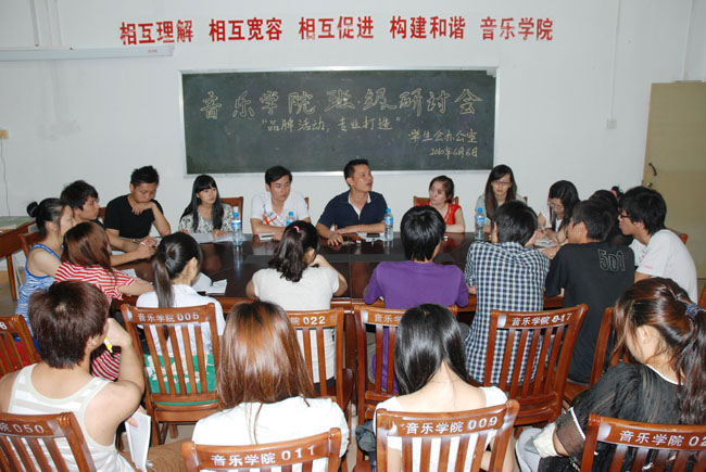 湛师新闻网6月7日讯 昨天,音乐学院在咏雷楼会议室召开以“品牌活动专业打造”为主题的班级研讨会。音乐学院党委黄增副书记、辅导员谢锦江、“优秀班长”黄文曼、邢艺婳以及09—07级各班班长参加了此次会议。