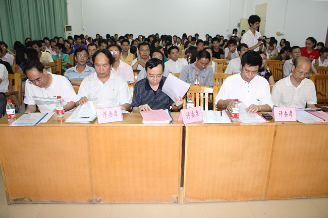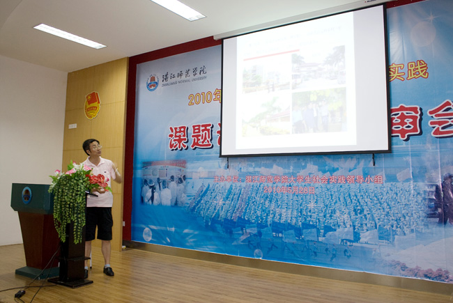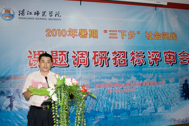 湛师新闻网6月2日讯 5月28—29日,我校在大学生活动中心学生学术报告厅隆重举行了2010年暑期社会实践活动调研课题招标和团队答辩两场评审会。校党委宣传部陈恕平部长、教务处处长朱城教授、人事处吴进处长、博雅教育中心主任李赣教授、思想政治理论课教学部林春书记、校团委李粤书记、各竞标项目的指导老师和调研队队员代表出席了评审会。其中,陈恕平部长、朱城处长、吴进处长、李赣主任、林春书记担任评委。
