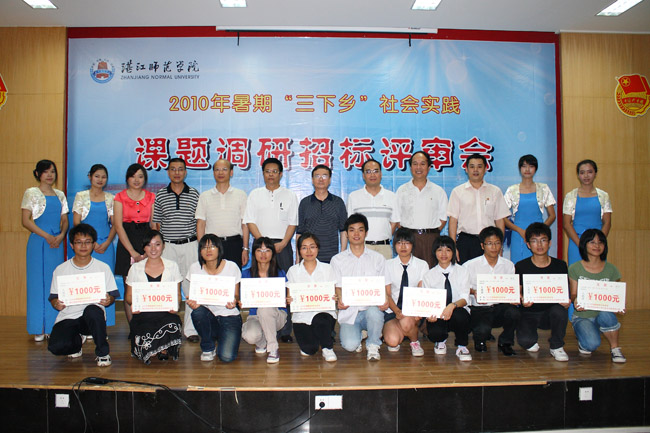 经过评委闭门讨论,最终确定10个中标项目,它们属在的团队依次为:法政学院邓小平理论研究协会社会实践队、法政学院“新农村”调研队、外语院“绿影”社会实践队、教科院“博远”社会实践队、生科院粤西地区水资源调查社会实践队、商学院“情系东海岛”社会实践队、教科院“情牵九比”社会实践队、信息院“牵手农村”社会实践队、人文学院“曙光”社会实践队、物理院革命老区情况专项调研队。每个项目均获得学校1000元人民币的经费支持。外语院“希望”社会实践队、数科院“稻香”社会实践队和化学院“七月流萤” 社会实践队的三个项目被评为备选项目,也将有机会获得学校的经费支持。