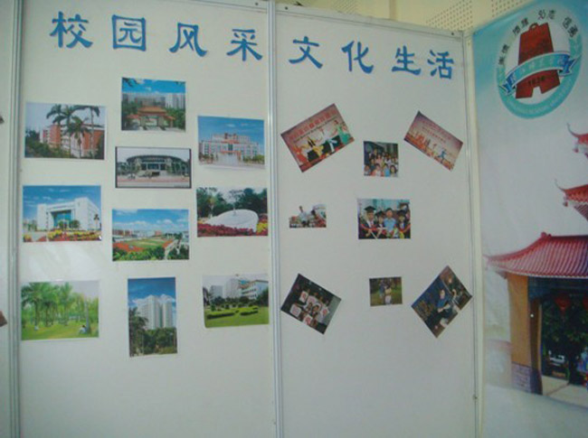 展台正中为学校正校门,厚重典雅;左面是我校师生精心从各自“库存”中选择的照片,从左到右分别为国际交流、校园风采、文化生活三个栏目。展台右面利用租用的投影仪播放我们自己从网络上下载来的我校视频介绍。