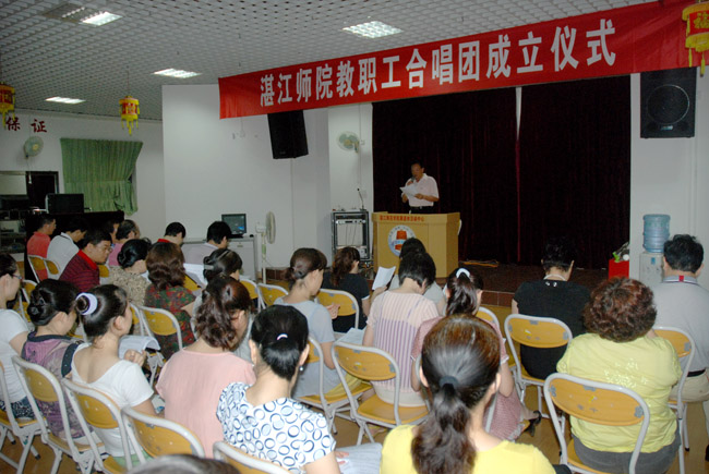 据了解,教工合唱团是由来自学校歌咏爱好者组成的为活跃校园文化生活,促进学校精神文明建设,以开展歌咏活动为主的群众性文艺团体,是展现湛江师院教职员工精神风貌和文艺素养的窗口。合唱团团员是在教职工自愿报名的基础上组建的,首批团员共50人,有二级学院的院长、党委书记、教授、博士、行政部门的处长等人员。合唱团分别由男女高低声部组成。
