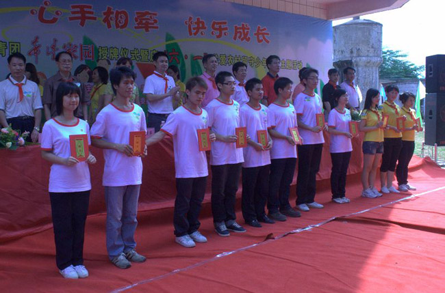 湛江市委副秘书长、市直工委书记刘光,团市委书记、市青联主席吴国雄与遂溪县领导为广东医学院附属医院等10个单位代表授了“湛江共青团希望家园”牌匾,为我校揭育行同学以及湛江其他高校学生关爱农村留守儿童志愿辅导员颁发聘书。