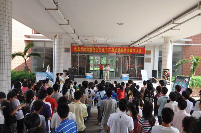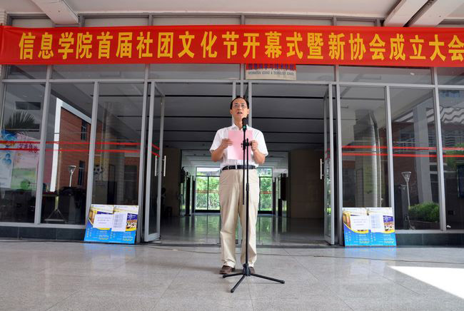 湛师新闻网5月31日讯 为丰富同学们的文化生活,推动了校园文化及精神文明建设,昨天上午,信息学院在雷阳楼B栋门前举行首届社团文化节开幕式暨新协会成立大会。信息学院张炜副院长,陈晓辉老师、武成香老师、闵笛老师,辅导员谢统年老师和各二级学院社团学生代表等出席了开幕式。
