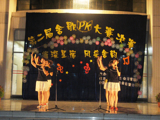 湛师新闻网5月30日讯 昨晚,由外国语学院学生会宿管部、信息院学生会宿管部联合主办,以“同唱一首歌,共抒宿舍情”为主题的第二届舍歌PK大赛总决赛在综合楼A幢门前举行。