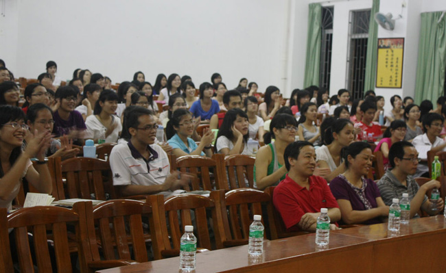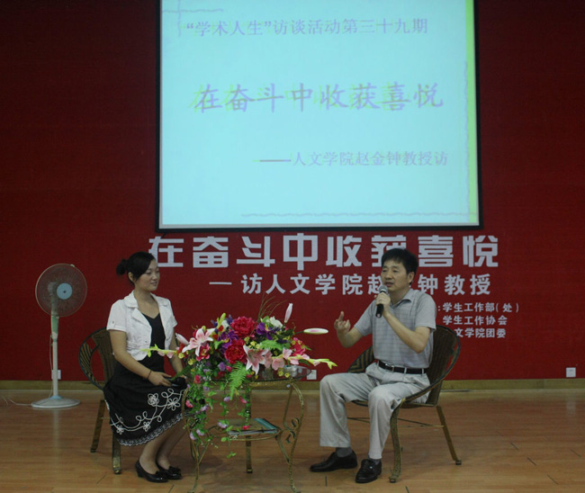 湛师新闻网5月29日讯 昨晚,由校学生工作部(处)主办,学生工作协会和人文学院团委承办的第三十九期人生访谈活动在弘雷楼311教室举行,人文学院副院长赵金钟教授做客本期访谈,与学生分享他的学术与人生。张德明博士后、学生工作处王兴刚老师、赵金钟教授的夫人出席了访谈。