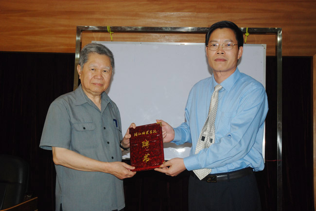 在邵乐喜副院长对潘毓刚教授的个人事迹及取得的学术成就作简要介绍之后,罗海鸥院长为潘毓刚教授颁发了学校名誉教授聘书。